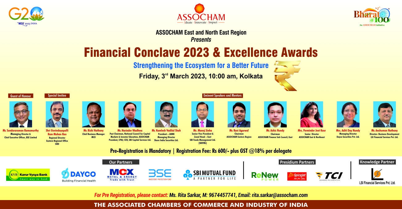 With this perspective in view and to highlight the potential of our country, especially Eastern India as a prominent and vibrant Financial Hub, ASSOCHAM is organizing Financial Conclave 2023 – Strengthening the Ecosystem for a Better Future and Excellence Awards, one of the biggest national level stakeholders meet focusing on financial markets, fund raising, international investing, financial best practices, family office management, etc on Friday, 3rd March 2023 at 10.00 a.m. at Kolkata, West Bengal.